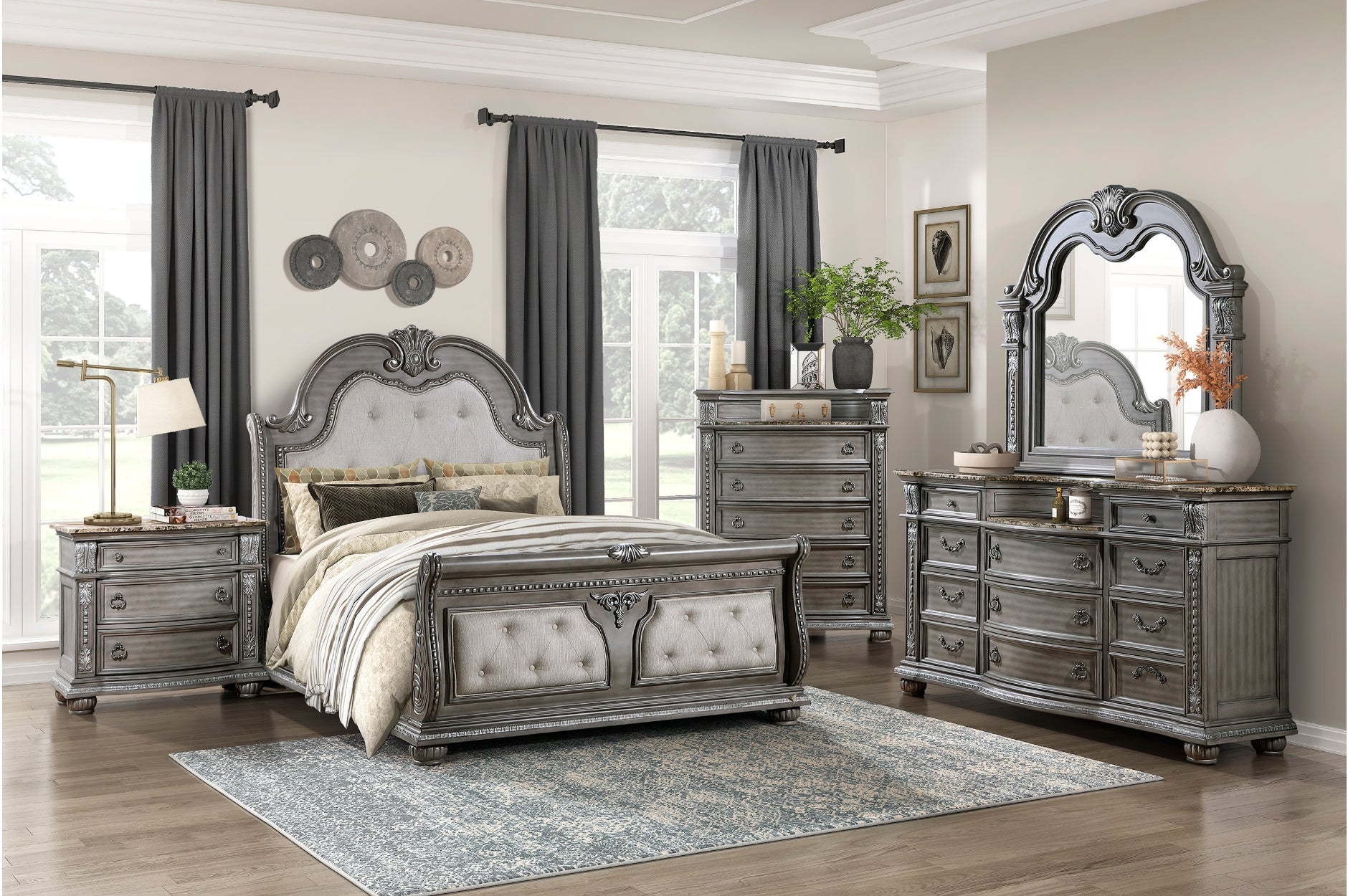 Add a touch of sophistication to your bedroom with the chic and classy Rosa Furniture. This luxurious collection combines classic accents and traditional design elements, including carved bun feet and acanthus leaf carving. The centerpiece is the grand sleigh bed, adorned with button-tufted, gray textured linen-like fabric and antique pewter-finished hardware on the drawers. The dresser, chest, and nightstand are topped with stunning marble, while the mirror boasts the same elegant frame as the rest of the collection. The stylish gray finish with subtle silver tipping adds the perfect finishing touch.