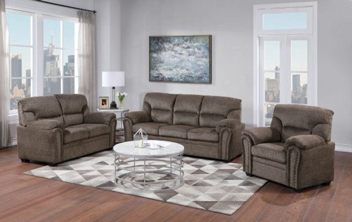 GREY, BROWN FABRIC SOFA/LOVE/CHAIR