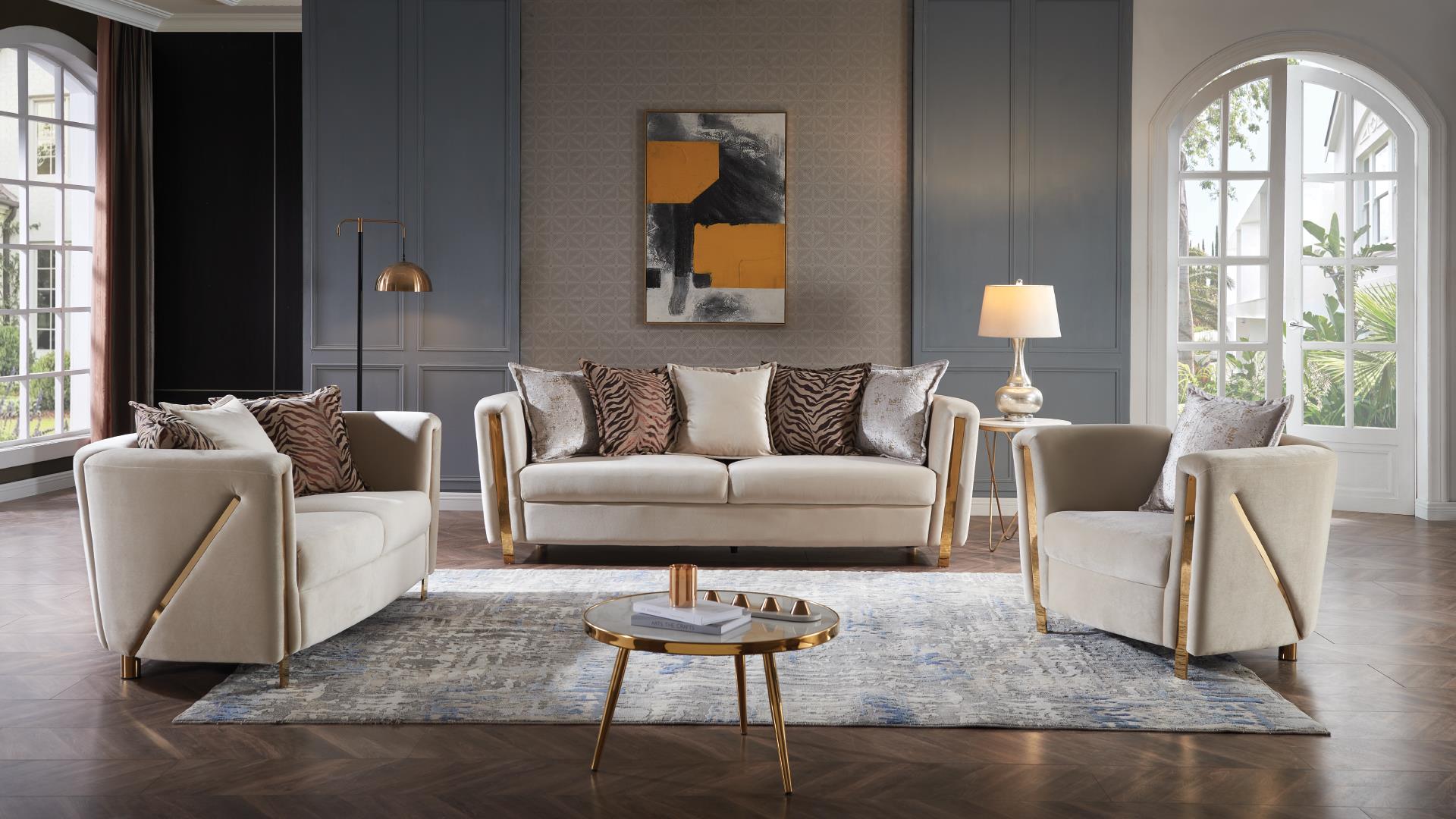 Elevate your living room with the effortlessly chic Chanelle set. Not only is it beautifully designed in a neutral beige hue, but the set also boasts a sophisticated and playful touch, making it the perfect addition to any home. (Say goodbye to bland décor and hello to a set that's as stylish as it is functional!)