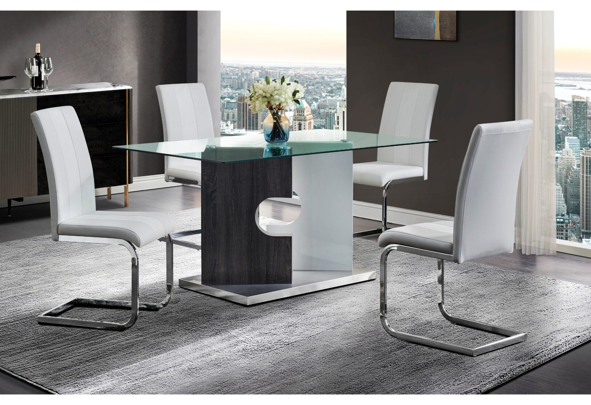 Who wouldn't want to gather loved ones around this stunningly modern and spacious dining table? With a unique double pedestal base in gray wash and white finish, a glass top, and metal supports, this table is the perfect addition to any dining room. Quality craftsmanship makes it a must-have for your space.