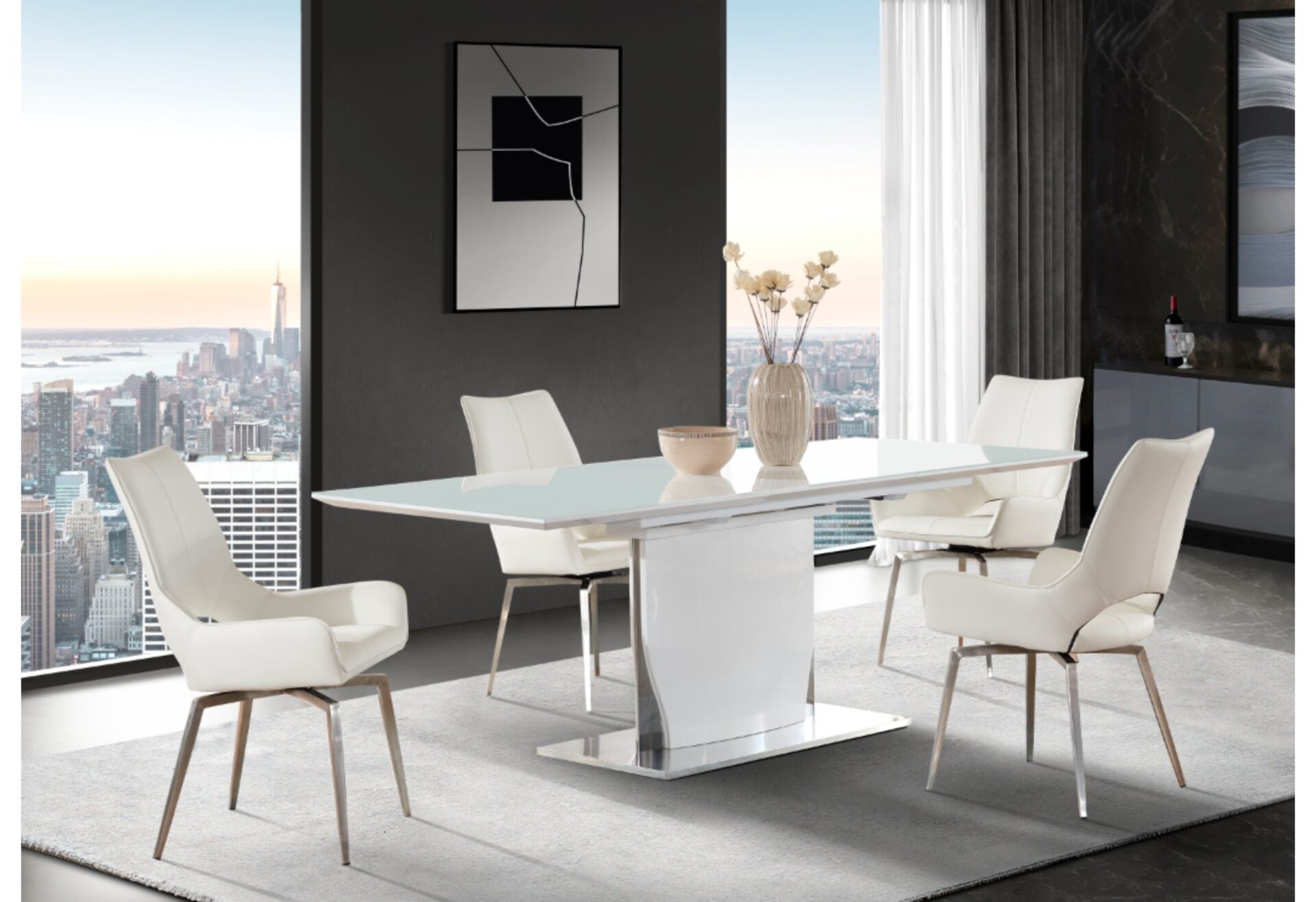 Embrace the latest and most simplistic design, perfect for your modern dining area. The shiny white surface with touches of brushed stainless steel is effortlessly stylish. The transparent glass top sits atop white glossy wood, expanding from 63in to 87in to comfortably accommodate all your visitors. The cleverly hidden butterfly leaf easily tucks under the table when not needed.