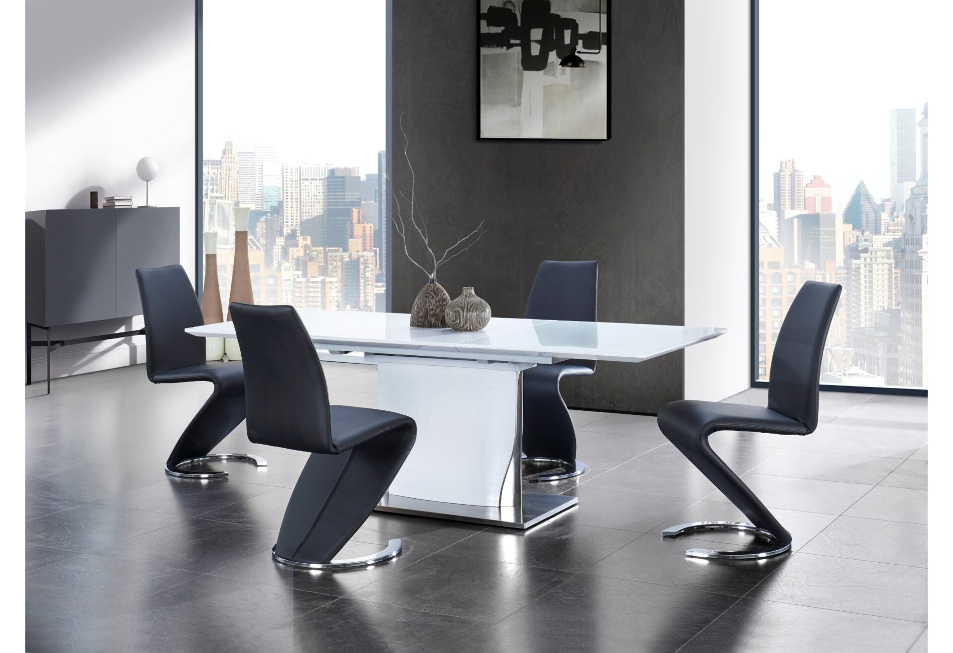 Experience the latest in modern and simplistic design that is both visually appealing and functional for your modern dining area. With its polished white finish and stainless steel details, this table is at the forefront of current trends. The white high gloss wood surface, covered by a glass top, can expand from 63in to 87in to accommodate all your guests. When not needed, the self-storing butterfly leaf cleverly tucks away beneath the tabletop.