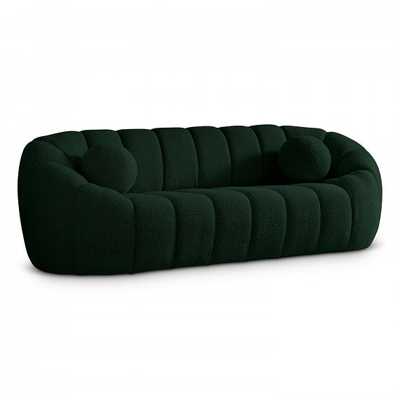 Sit back and relax in casual style when you bring home this Elijah boucle fabric sofa. Inspired by the unmistakably relaxed vibe created by a classic bean bag, this inviting sofa features a rounded design with deep channel tufting for added support and resilience. It comes with an accent pillow for even more welcoming comfort, and the sofa is upholstered all over with rich green boucle fabric that beckons you to sit, rest, and take it easy.