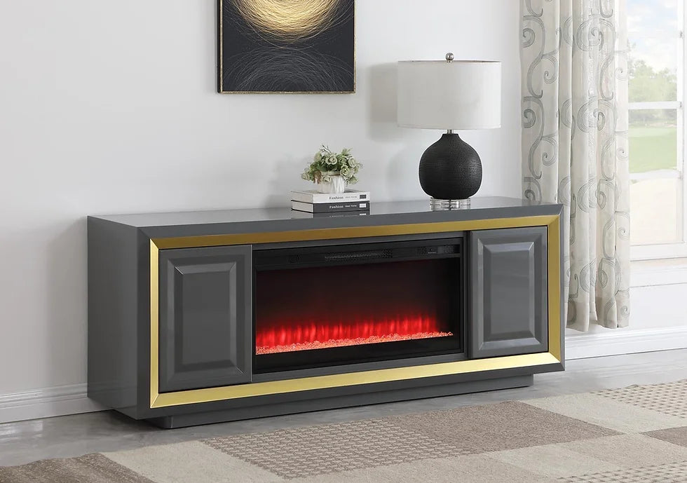 GLOSSY GREY, PAINTED SHINING GOLD, TWO DOORS, 36"INCH CRYSTAL FIREBOX WITH BLUETOOTH AND SPEAKER