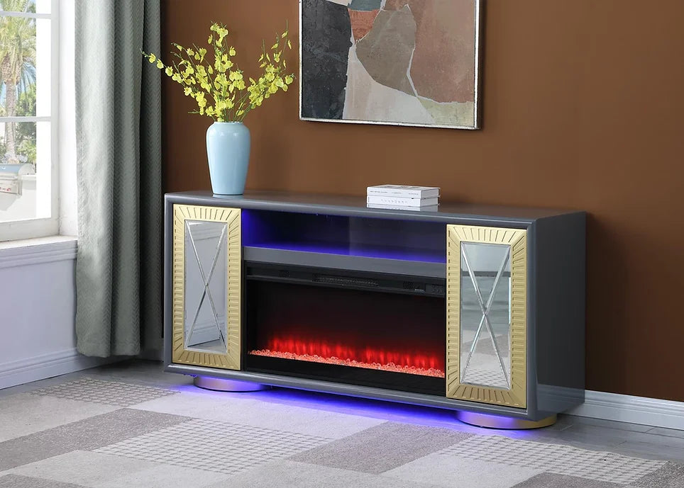 GLOSSY GREY, PAINTED SHINING GOLD WITH TWO DOORS RGB LED ON TOP AND BOTTOM, 36" CRYSTAL FIREBOX WITH BLUETOOTH AND SPEAKER